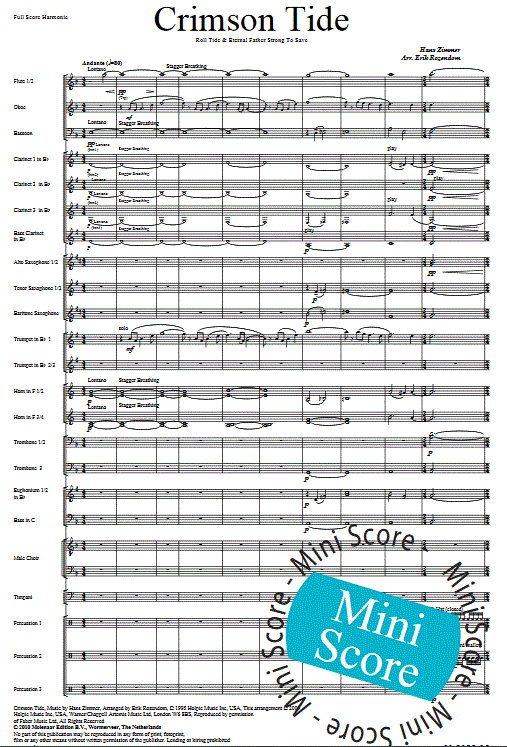 Zusatzinfo/Inhalt Crimson Tide ist ein amerikanischer Film von 1995 mit grossartiger Musik von Hans Zimmer. Für die Musik von Crimson Tide erhielt er nicht nur einen Grammy Award sondern auch den BMI Film Music Award. Dieses Arrangement eignet sich hervorragend als beeindruckender Ruhepunkt in Ihrem nächsten Konzert oder als ein geschicktes Einspielwerk für den nächsten Wettbewerb.